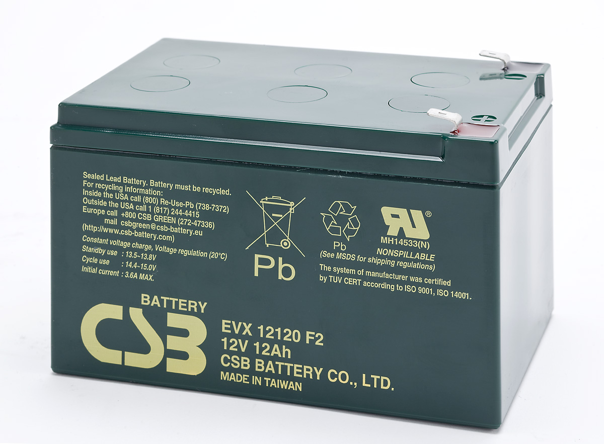 Артикул 7945 Производитель CSB Battery Серия EVX серия Технология AGM Cрок службы ~ 10лет Напряжение, В 12 Емкость, Ач 12 Клеммы F2 Типоразмер батареи (bat_type) 12_12 Длина, мм 151 Ширина, мм 98 Высота, мм 94 Полная высота, мм 100 Вес, кг 3.83 Гарантия, мес 12 Предоставленная информация об описании, технических характеристиках, комплекте поставки и внешнем виде товара носит справочный характер и может изменяться производителем без предупреждения. Заранее приносим извинения за возможные неточности и будем благодарны Вам за сообщение об ошибках. Уточняйте, пожалуйста, важные для Вас параметры при заказе.